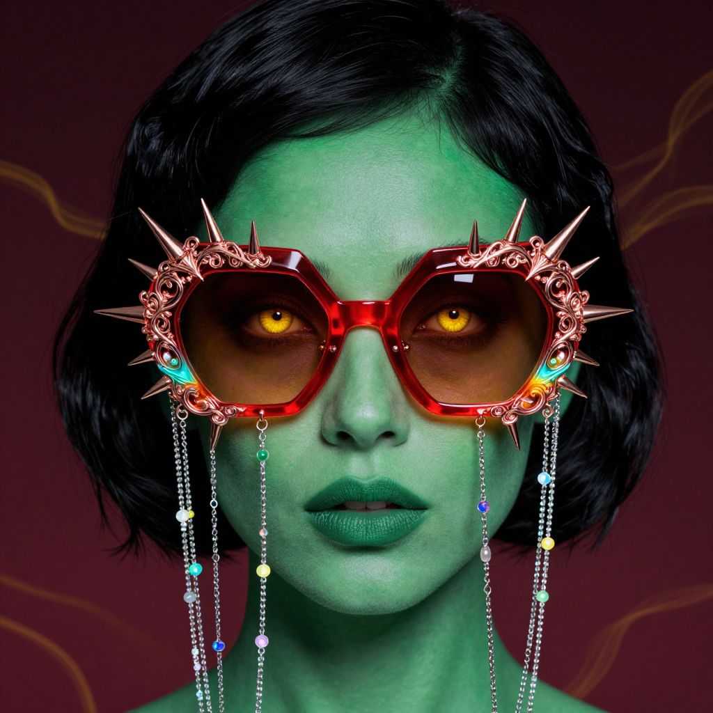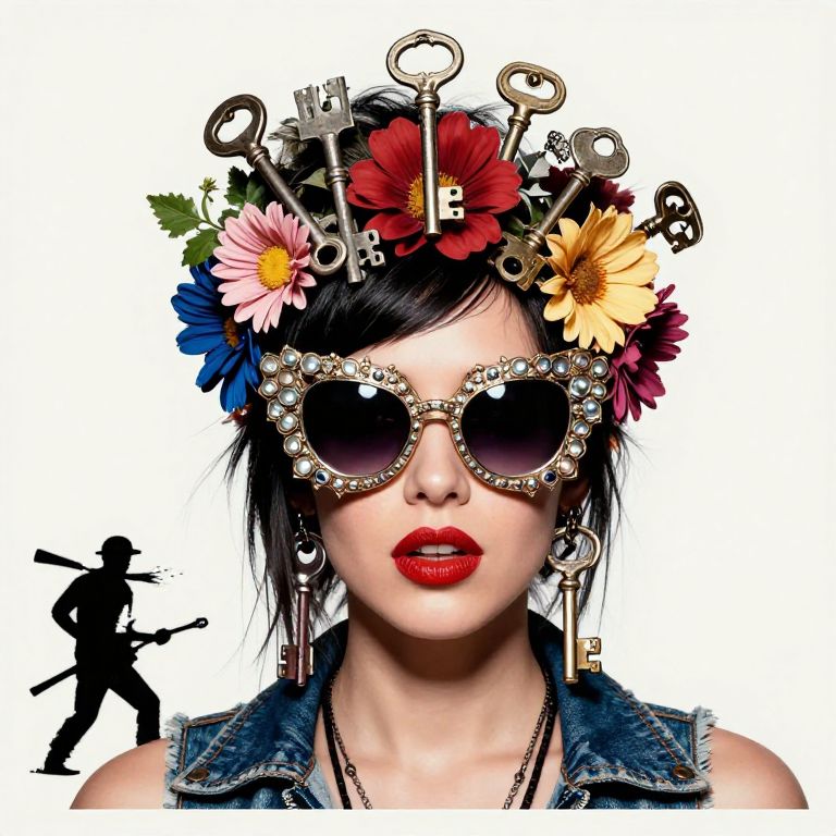 Adhesive emergence is our queen - a punk queen wearing ornate oversize sunglasses and crown made of large of keys and flowers 2001 space odyssey style of jean mirror and banksy and guy bourdin,