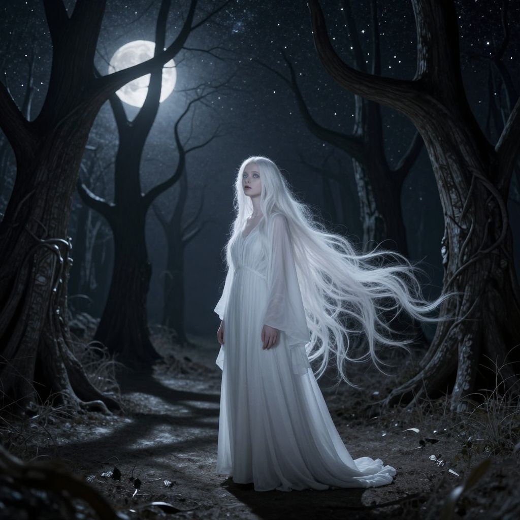 Photograph of a pale-skinned woman with long, flowing white hair, wearing a white, floor-length gown, standing in a dark, moonlit
