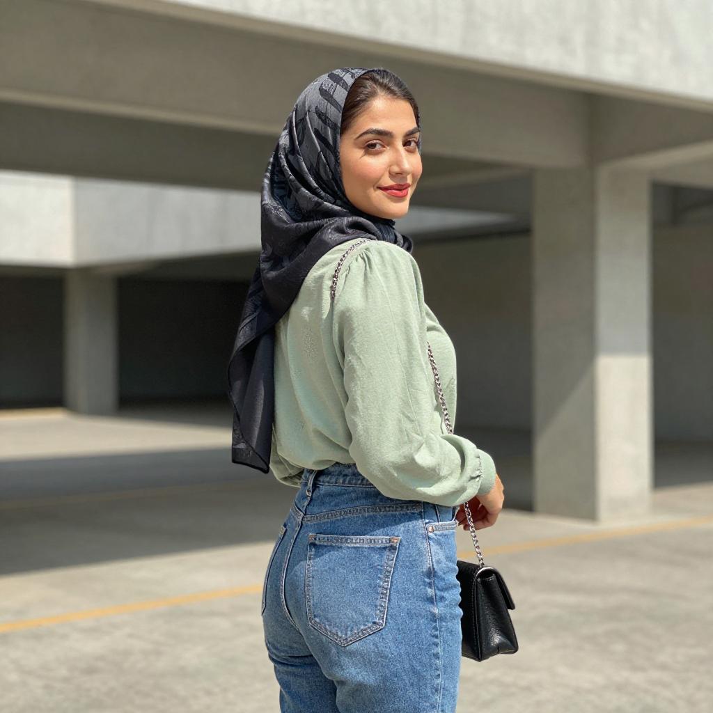 Photograph of a young woman with light skin and long black hair, wearing a black hijab, black long-sleeve top, and light blue high-waisted jeans. She carries a red cross-patterned shoulder bag and looks over her shoulder with a slight smile. She stands on a paved path with a grassy area and modern buildings in the blurred background.