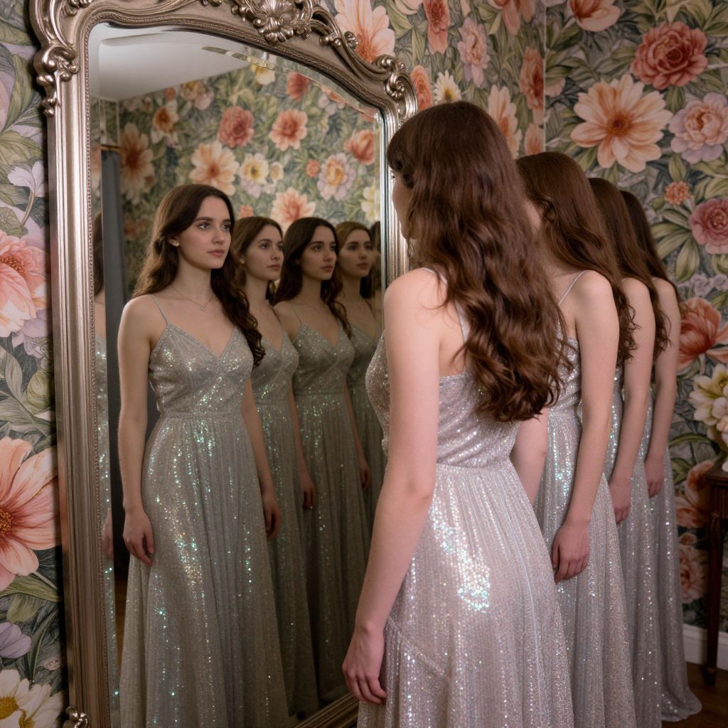 Photograph of a brunette woman with long wavy hair, wearing a shimmering silver gown, standing before a floral-patterned mirror, reflecting multiple images