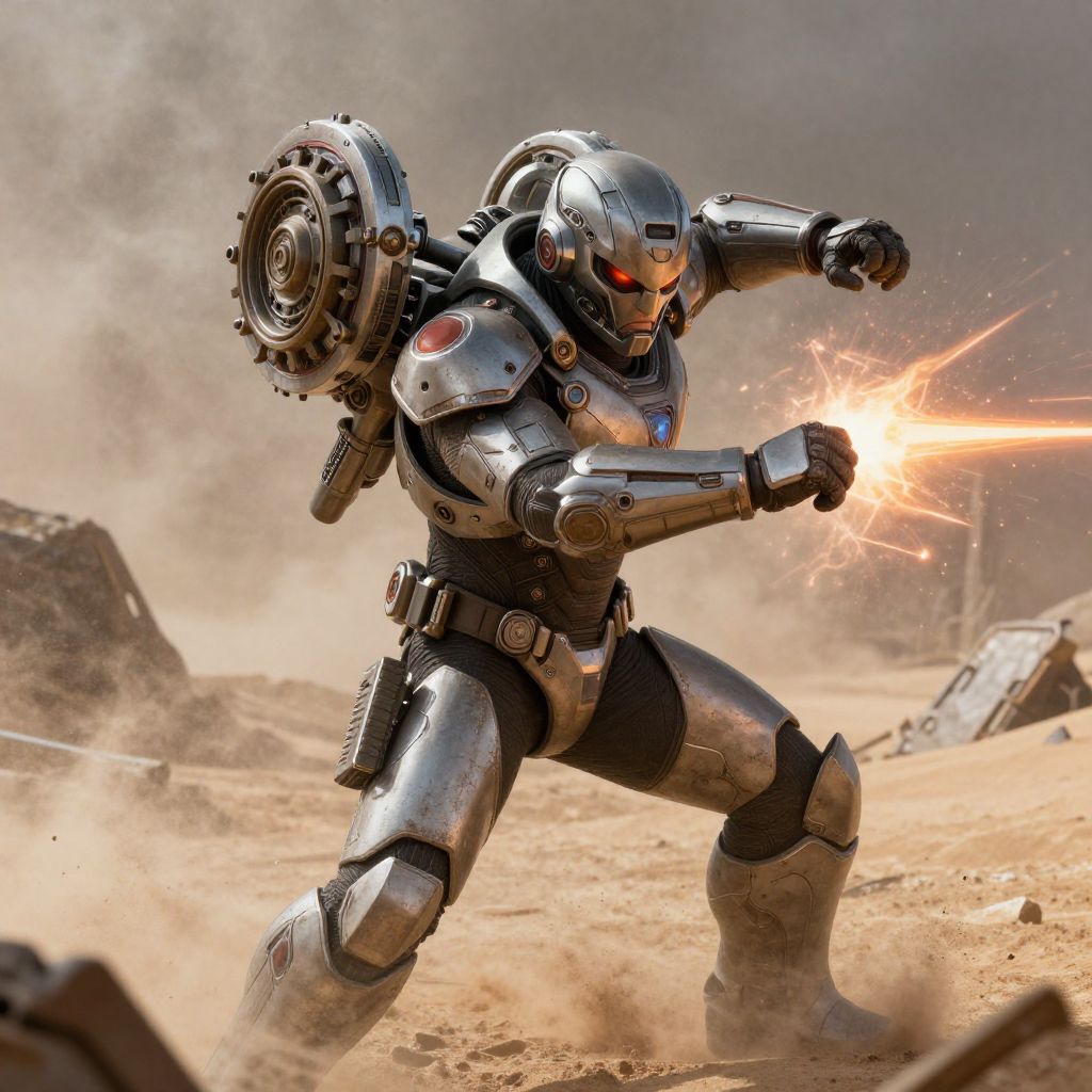 Captain Chaos costume in a futuristic battle suit with rotating gear parts, mid-combat in a post-apocalyptic desert, dust storms, glowing red eyes, intense energy bursts, cinematic composition, high resolution