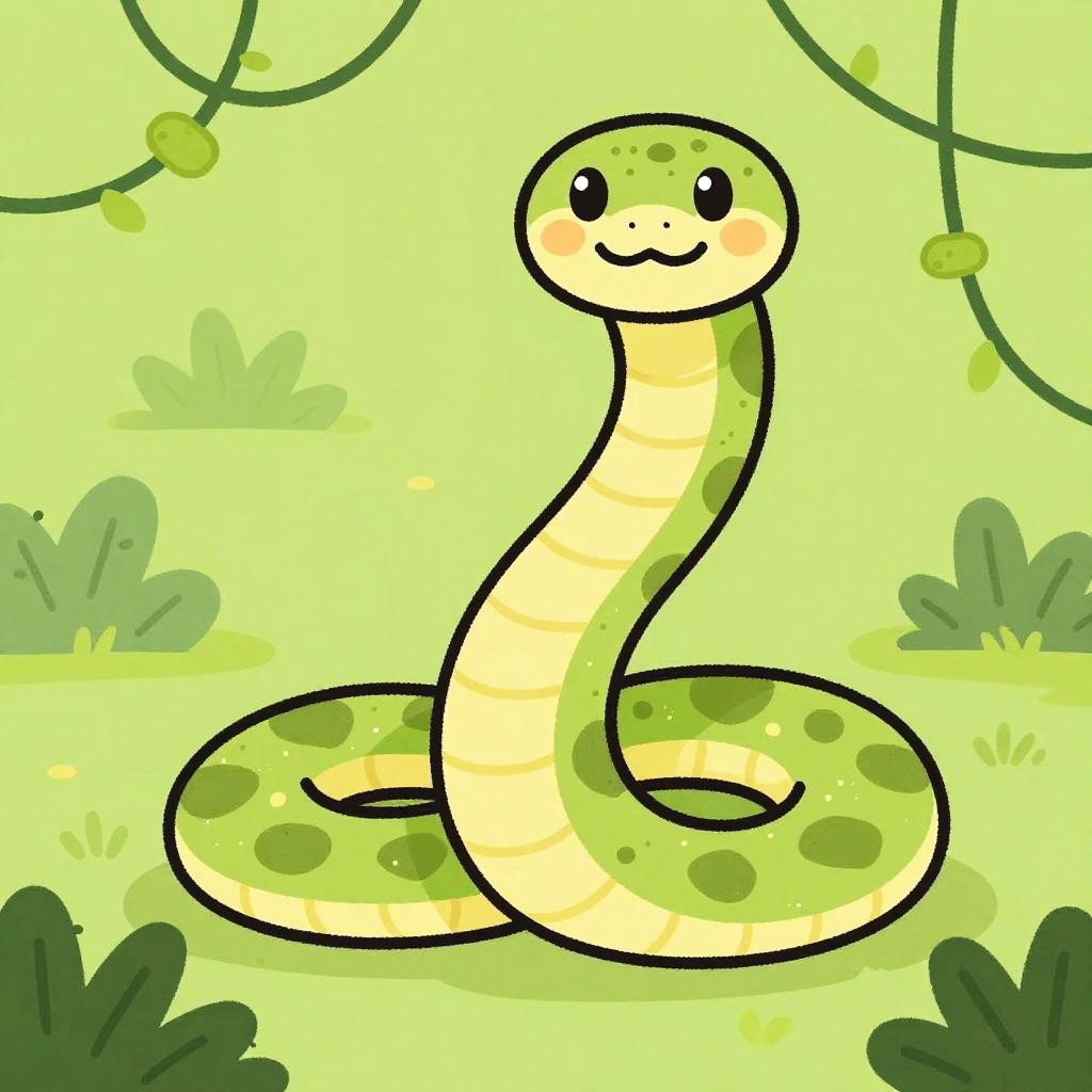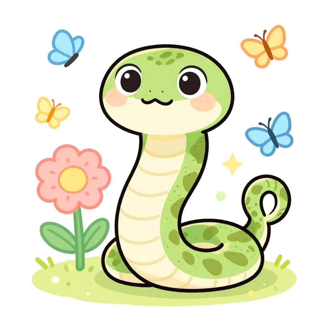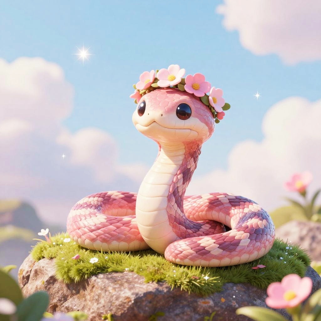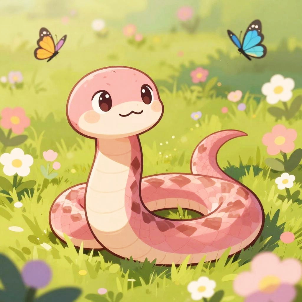 Adorable cute pink snake slithering playfully through a field of blooming flowers, bright pink scales with subtle gradients, cartoonish style with a friendly smile, colorful meadow with butterflies and soft sunlight, joyful and lighthearted mood