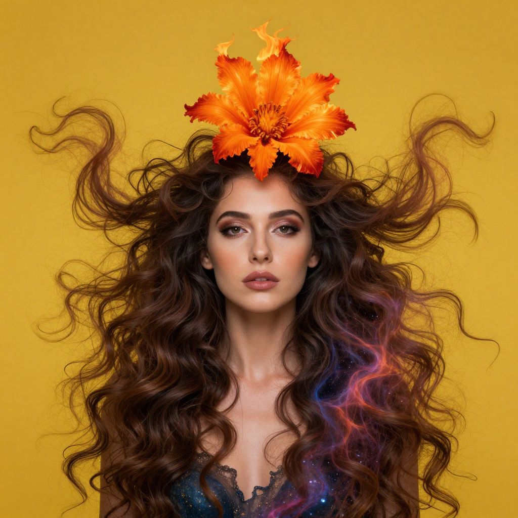 An ethereal portrait of a woman adorned with vibrant, otherworldly accessories—a fiery orange flower blooms defiantly atop her head, while her hair swirls like a cosmic nebula against a radiant yellow backdrop, creating a surreal fusion of natural beauty and celestial wonder.