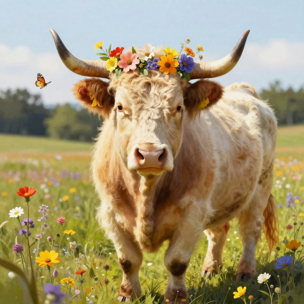 This digital painting features a Highland cow standing in a sunlit meadow, adorned with a vibrant floral crown. The cow's shaggy, cream-colored fur contrasts with the colorful wildflowers surrounding it. Its large, curved horns frame a gentle, slightly shy expression. In the blurry background, a small butterfly hovers, adding a touch of magic to the serene scene.