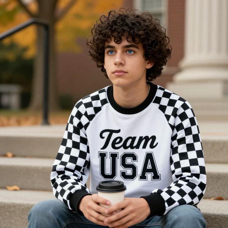 A college student with a sharp jawline, dark curly hair, and bright blue eyes, wearing a black-and-white checkerboard baseball sweatshirt with the word 'Team USA' printed in bold letters, sitting on a university steps during fall semester, holding a cup of coffee while gazing off into the distance with a determined look.
