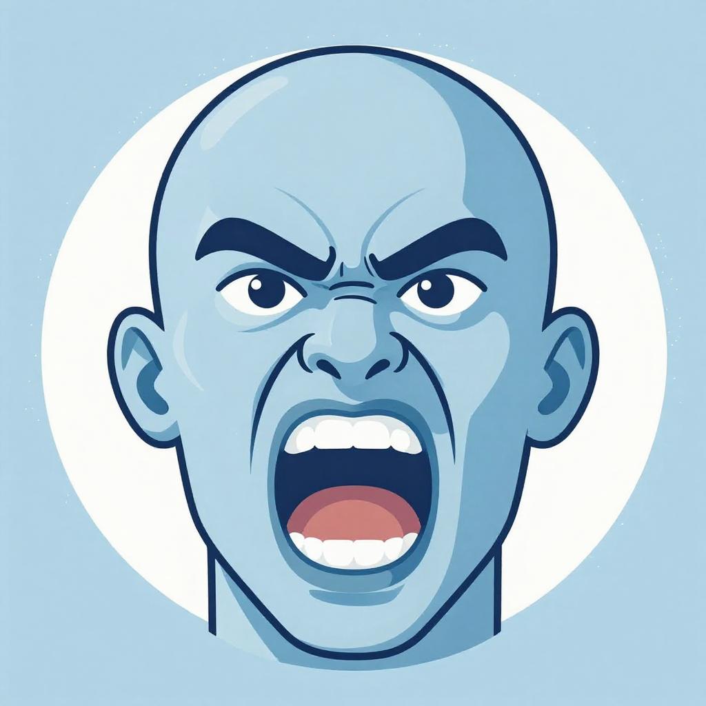 Digital vector illustration of an angry bald man with blue skin yelling with an open mouth. The man has thick black eyebrows, clenched teeth, and an expressive, intense facial expression. The background is light blue with textured white accents around the head.