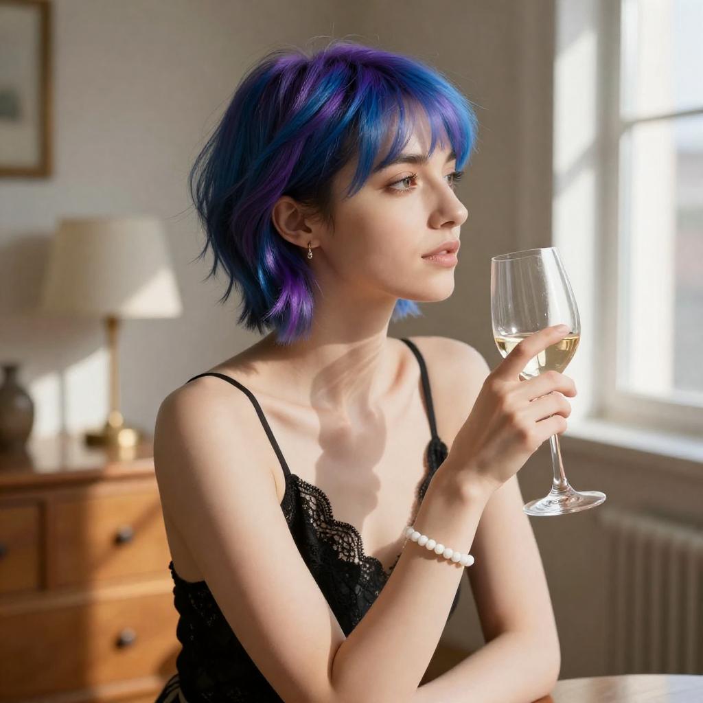 Photograph of a slender young woman with fair skin and short blue and purple hair wearing a black lace camisole and a white beaded bracelet. She is holding a wine glass with white wine, sitting in a warmly lit room with sunlight streaming through a window. The background includes a wooden dresser and a lamp.
