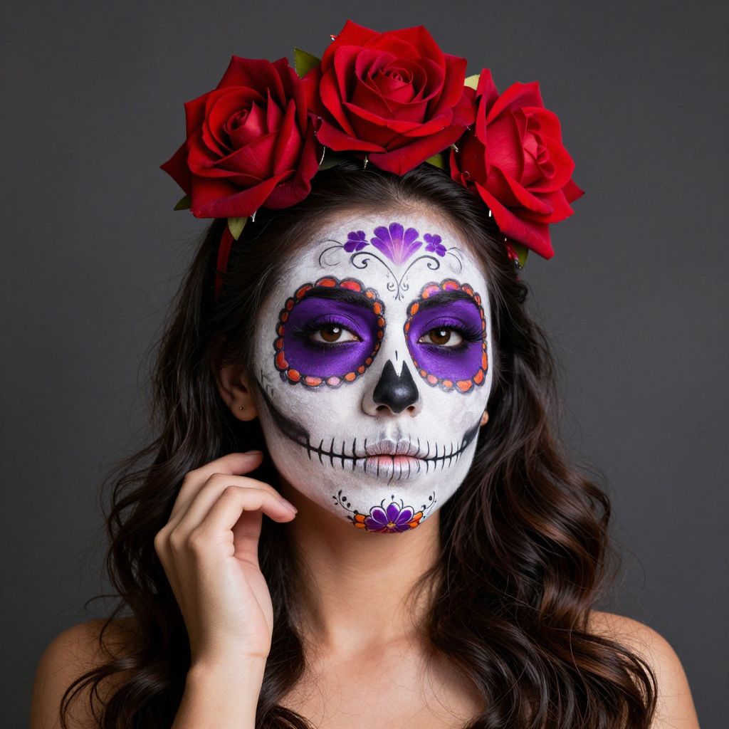 Woman showcasing intricate sugar skull makeup with bold purple eyeshadow, detailed floral patterns, and a striking red rose crown atop her dark hair, embodying vibrant Halloween-inspired calavera artistry.