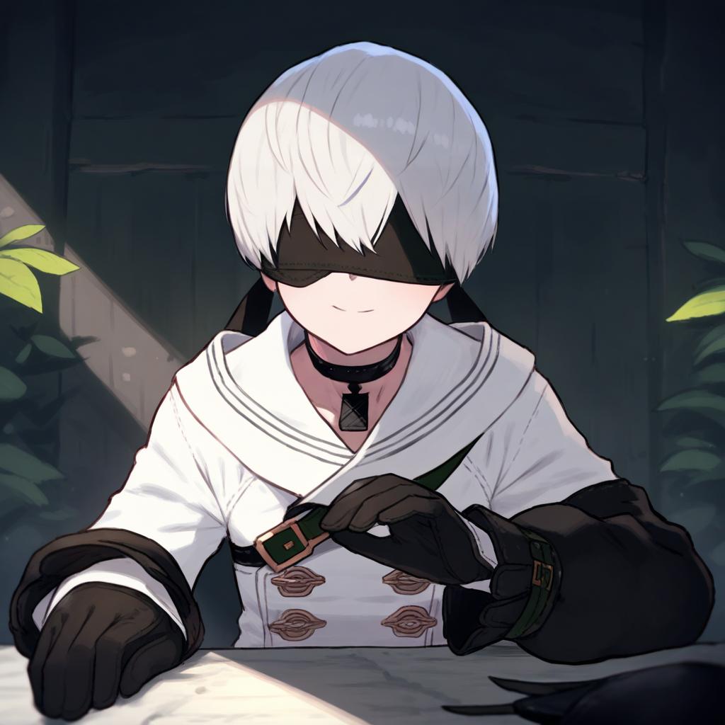 9s (nier:automata), nier (series), 1boy, white hair, short hair, black gloves, black choker, long sleeves, black blindfold, by artist chiwino, animagine