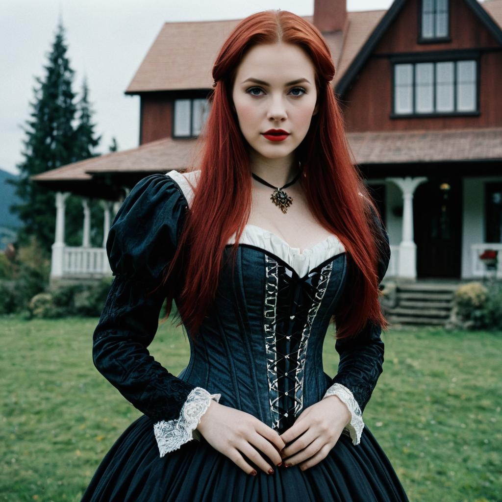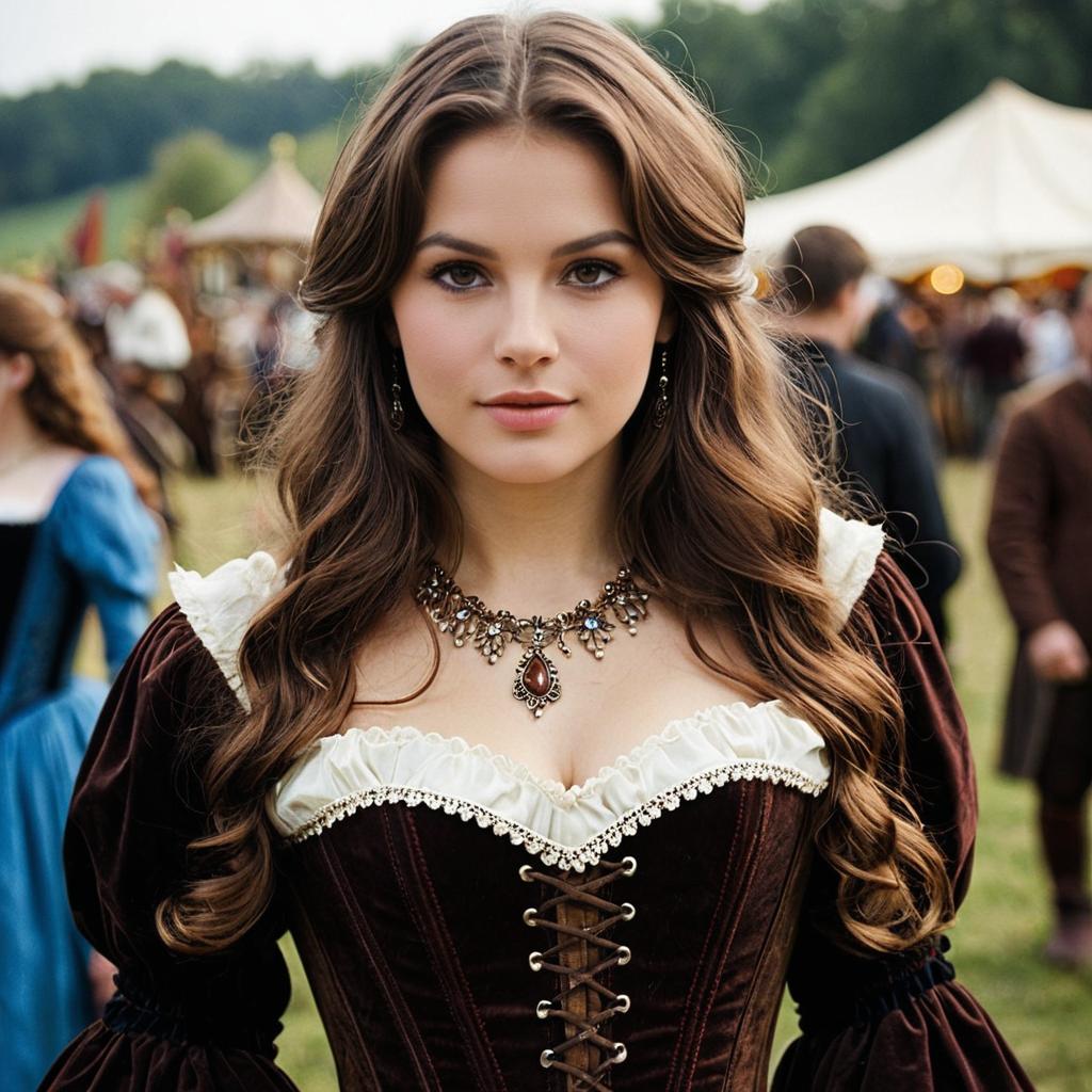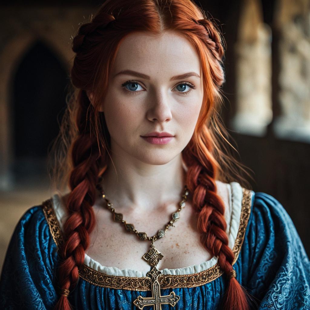 Dressing renaissance fair,jewelry, 1girl, dress, necklace, earrings, long hair, realistic, orange hair, blurry, blurry background, red hair, solo, looking at viewer, solo focus, puffy sleeves