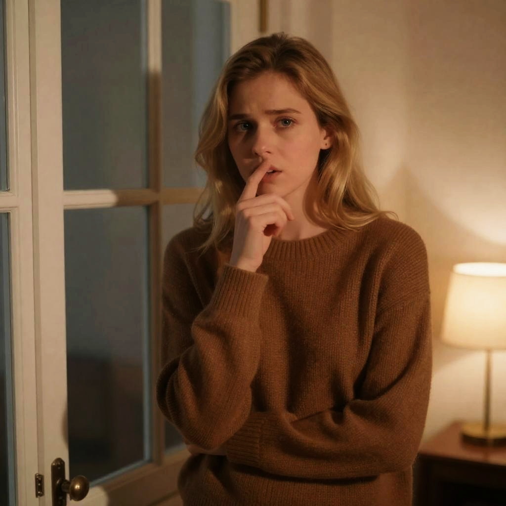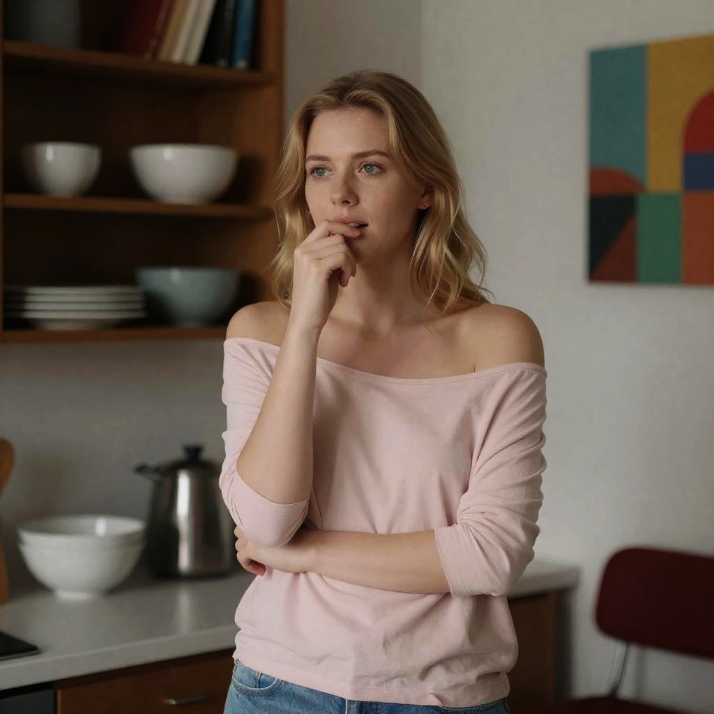 Blonde woman in off-shoulder pink shirt, standing in kitchen, hand to mouth, thinking. Wooden cabinet with bowls and plates. Bookshelves in background, red chair, colorful wall art. Dim lighting. Casual, thoughtful expression. One person.