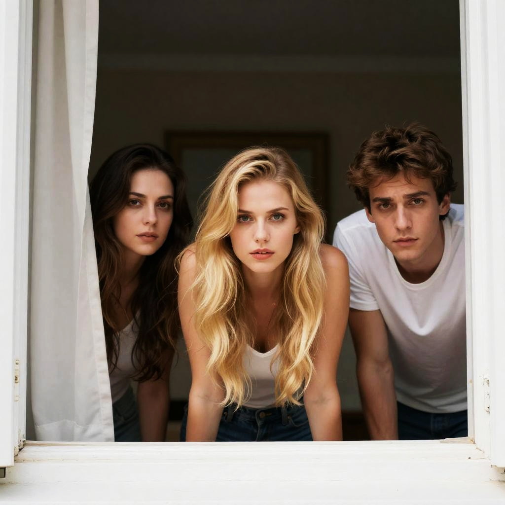 Three people peering through a window. Blonde woman in center, brown-haired woman on left, brown-haired man on right. All wear casual clothes. Window frame and curtain partially visible. Intense expressions, leaning forward. Indoor background.