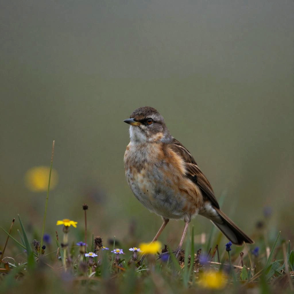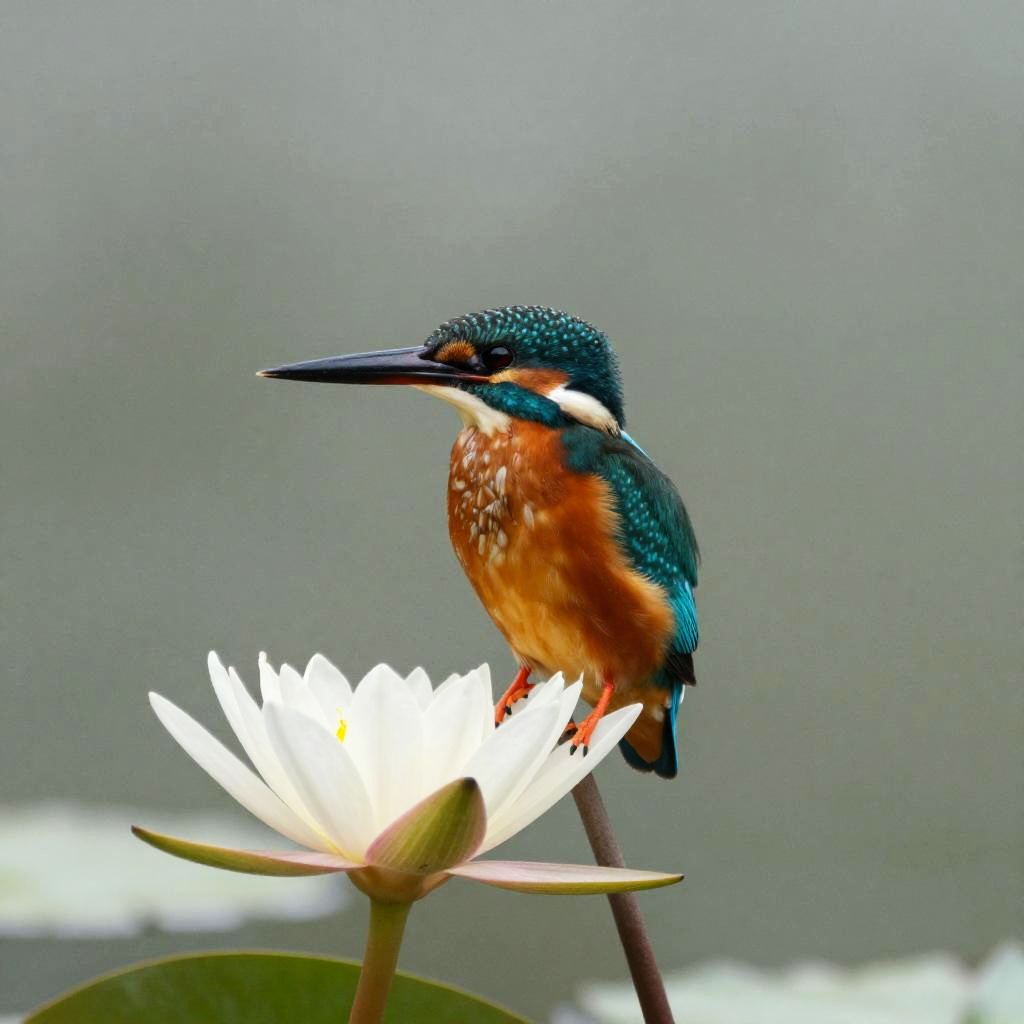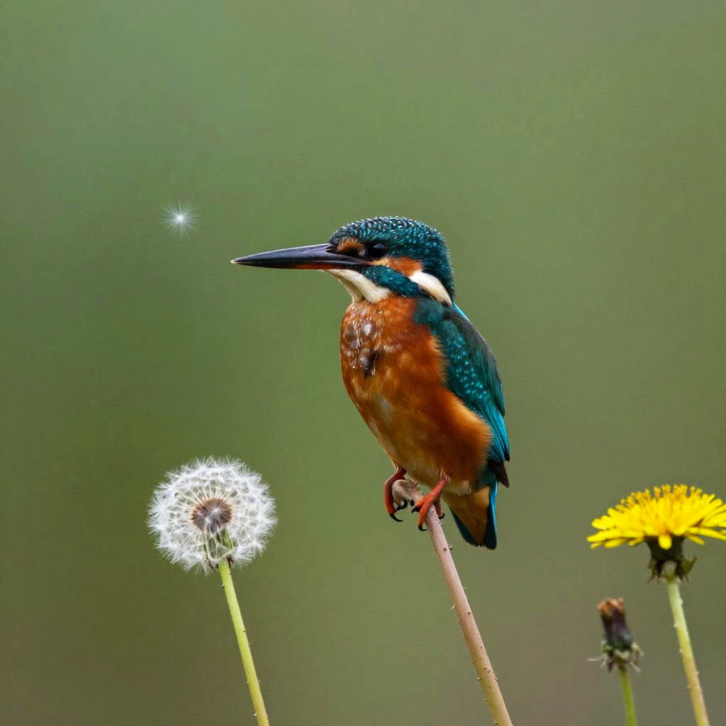 Full body, solo, kingfisher, blue eyes, realistic, looking at viewer, dandelion, evening breeze, green background