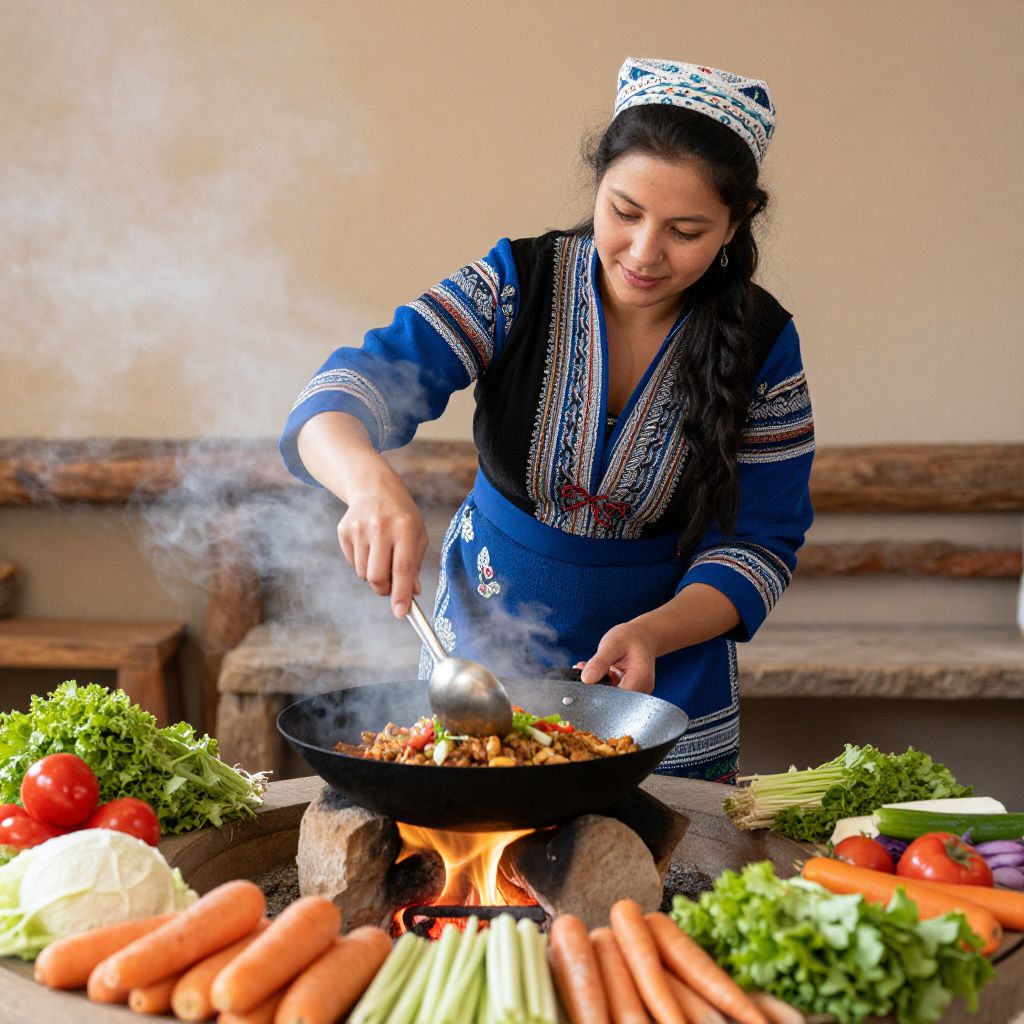 A woman in traditional attire skillfully cooks a dish over a fireplace, surrounded by fresh ingredients.