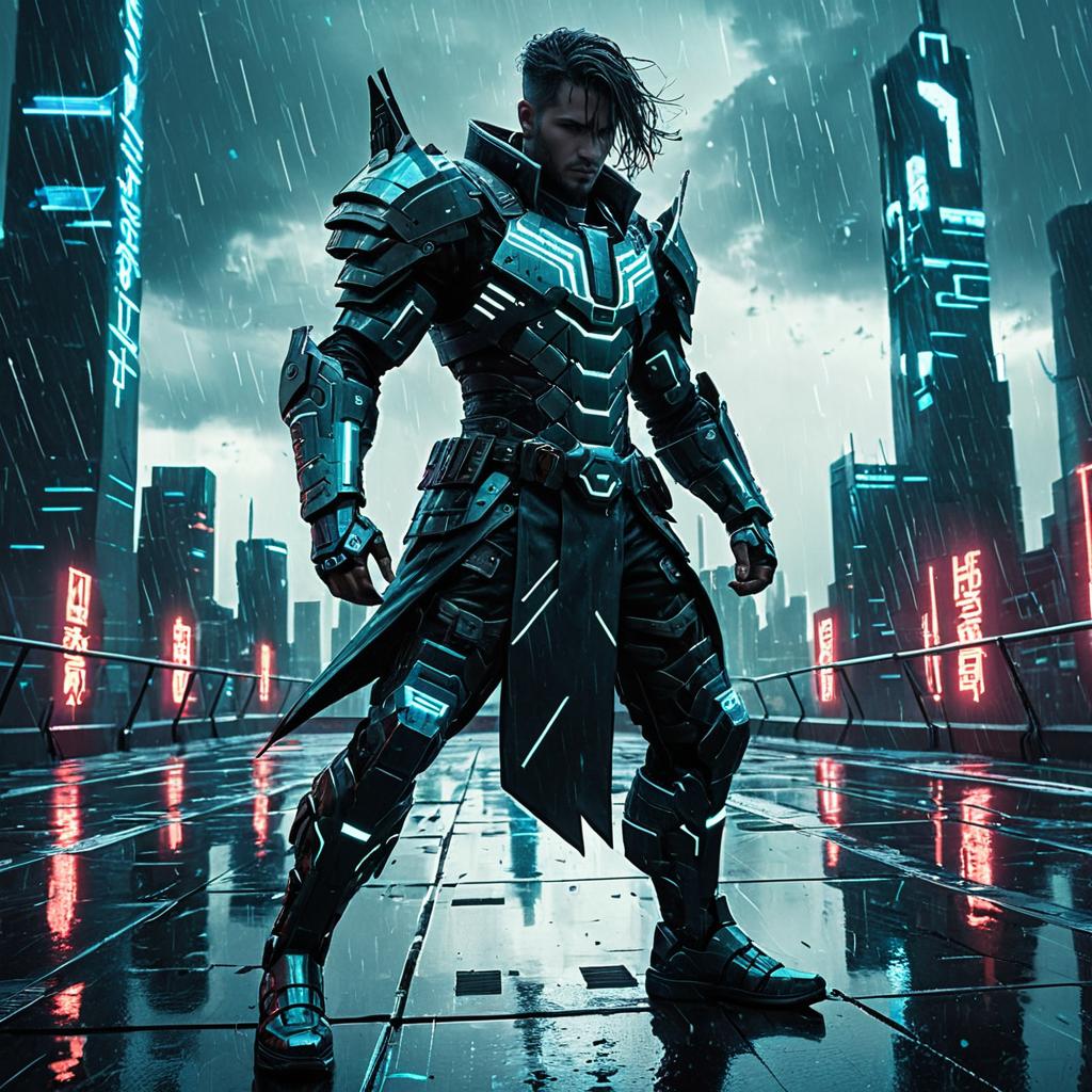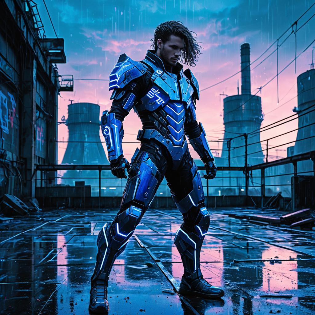 Male cybernetic warrior with electric blue circuitry in an abandoned industrial rooftop at twilight, dynamic battle stance with windswept hair and intricate armor, dramatic neon reflections on wet pavement, highly detailed digital painting in futuristic cyberpunk art style, sharp focus, atmospheric mood.