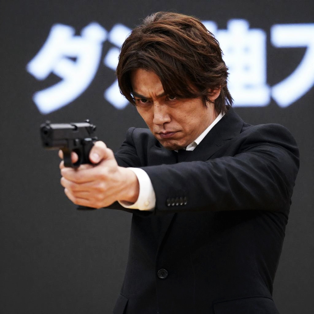 Photograph of a man with medium-length, wavy brown hair, wearing a black suit and white shirt, aiming a black handgun with his right hand. His face is intense, with a focused expression. Neon Japanese characters in the blurry background. He is in a dynamic pose, with his arm extended forward.