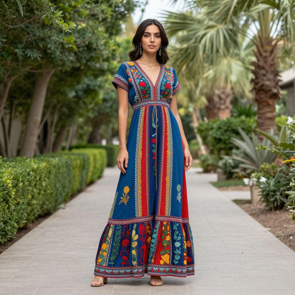 Woman wearing a vibrant embroidered maxi dress stands gracefully on a paved pathway surrounded by lush greenery and palm trees, embodying the essence of Babylon's Garden.