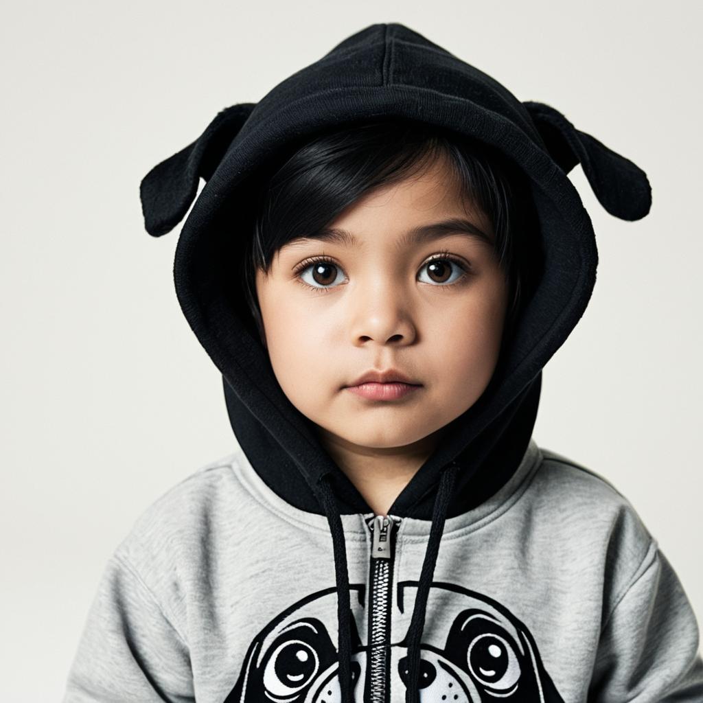 Close-up portrait of a young toddler wearing a white hooded sweatshirt. The child has short black hair with bangs and large dark eyes, staring directly at the camera with a closed mouth. The background is blurred, highlighting the child’s face and soft clothing texture.