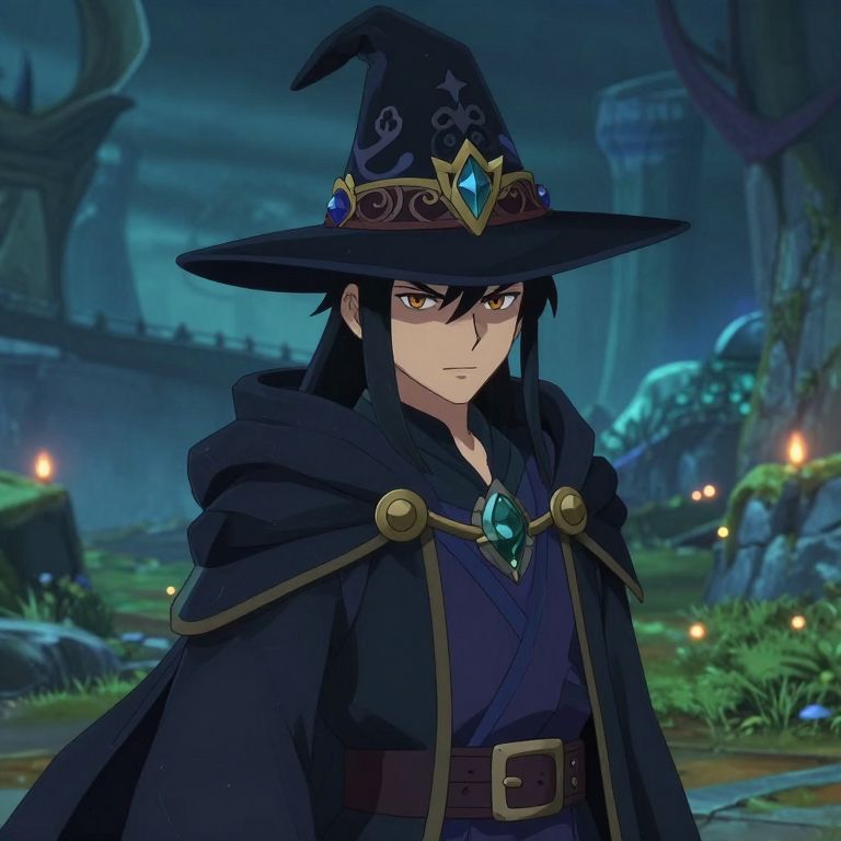 A wizard in a fantasy world, wearing a hat adorned with intricate designs, stands amidst a mystical, anime-style landscape.