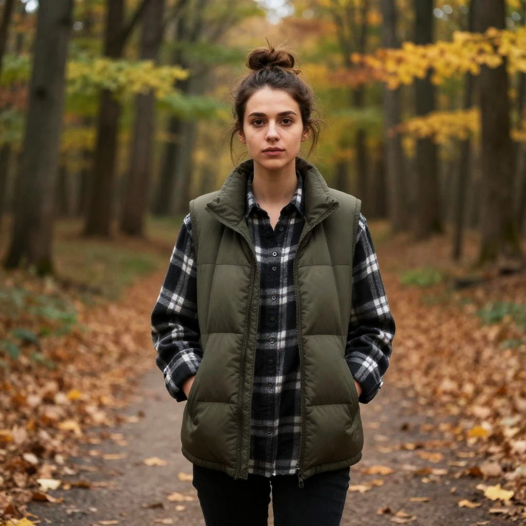 Photograph of a young woman standing in a forest during autumn. She has light skin, brown hair in a messy bun, and is wearing a green puffer vest over a black and white plaid shirt. Her hands are in her vest pockets, and she has a neutral expression. The forest has tall trees with fallen leaves covering the ground, and the path behind her stretches into the distance. The background shows a mix of green and yellow leaves.