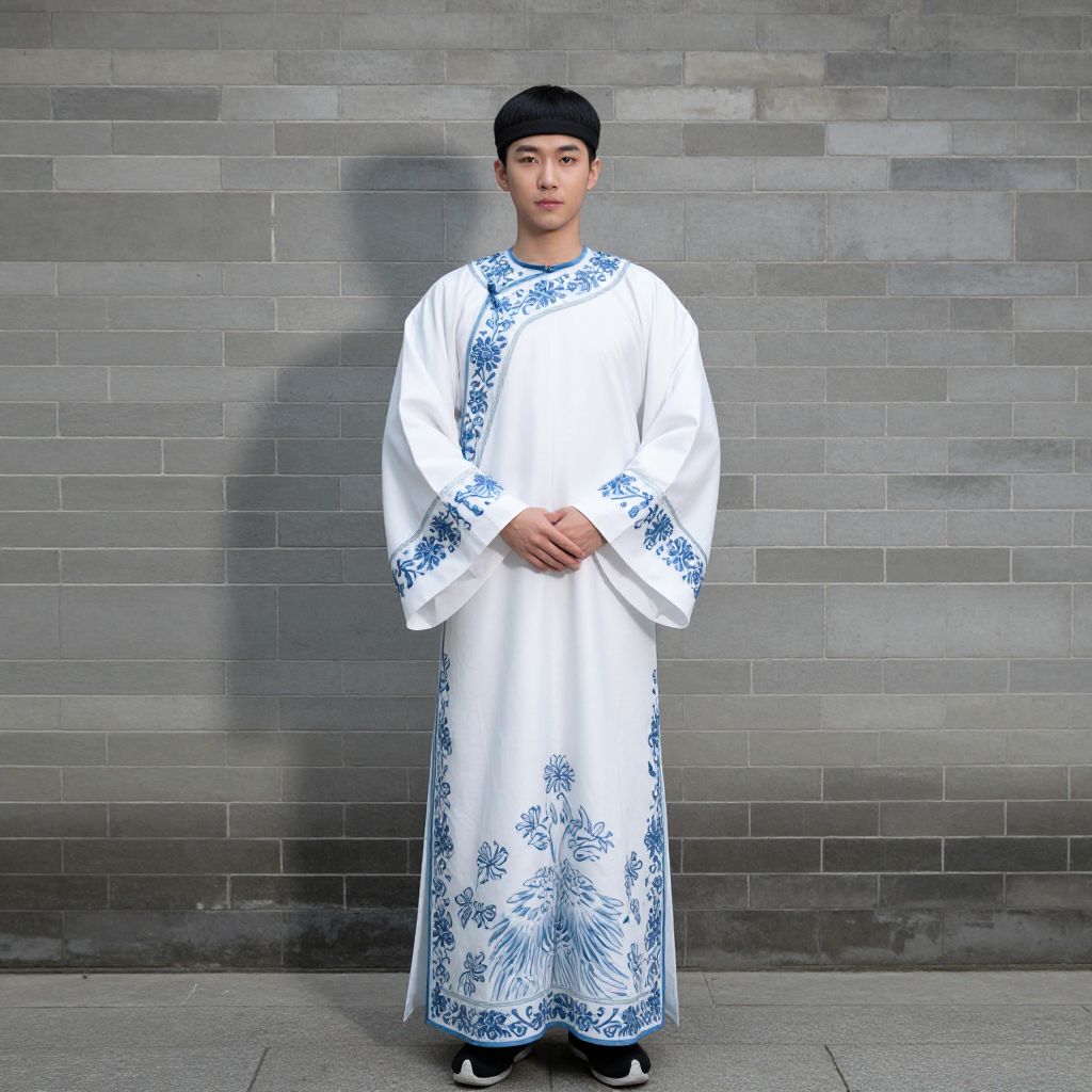 Melody Costume, man in a traditional chinese costume standing in front of a wall