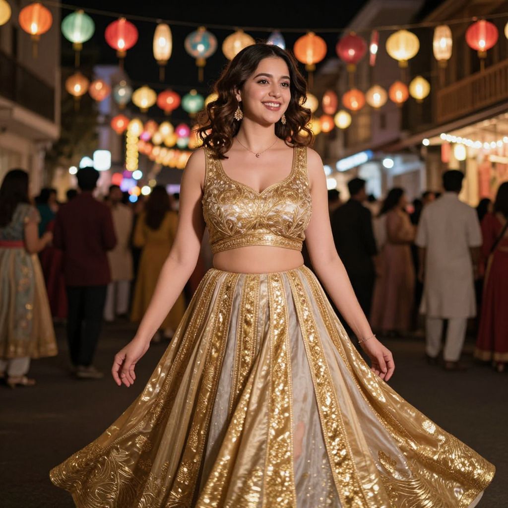 Photograph of a smiling South Asian woman with wavy dark brown hair, wearing a gold, sequined, sleeveless crop top and a voluminous, gold, sequined skirt. She stands in a nighttime street festival, surrounded by colorful, glowing lanterns hanging overhead. The background includes blurred figures of people in traditional attire, adding to the festive atmosphere. The woman's outfit shimmers under the lantern light, highlighting the intricate patterns. The scene is vibrant and lively, with a focus on the woman's elegant and festive attire.