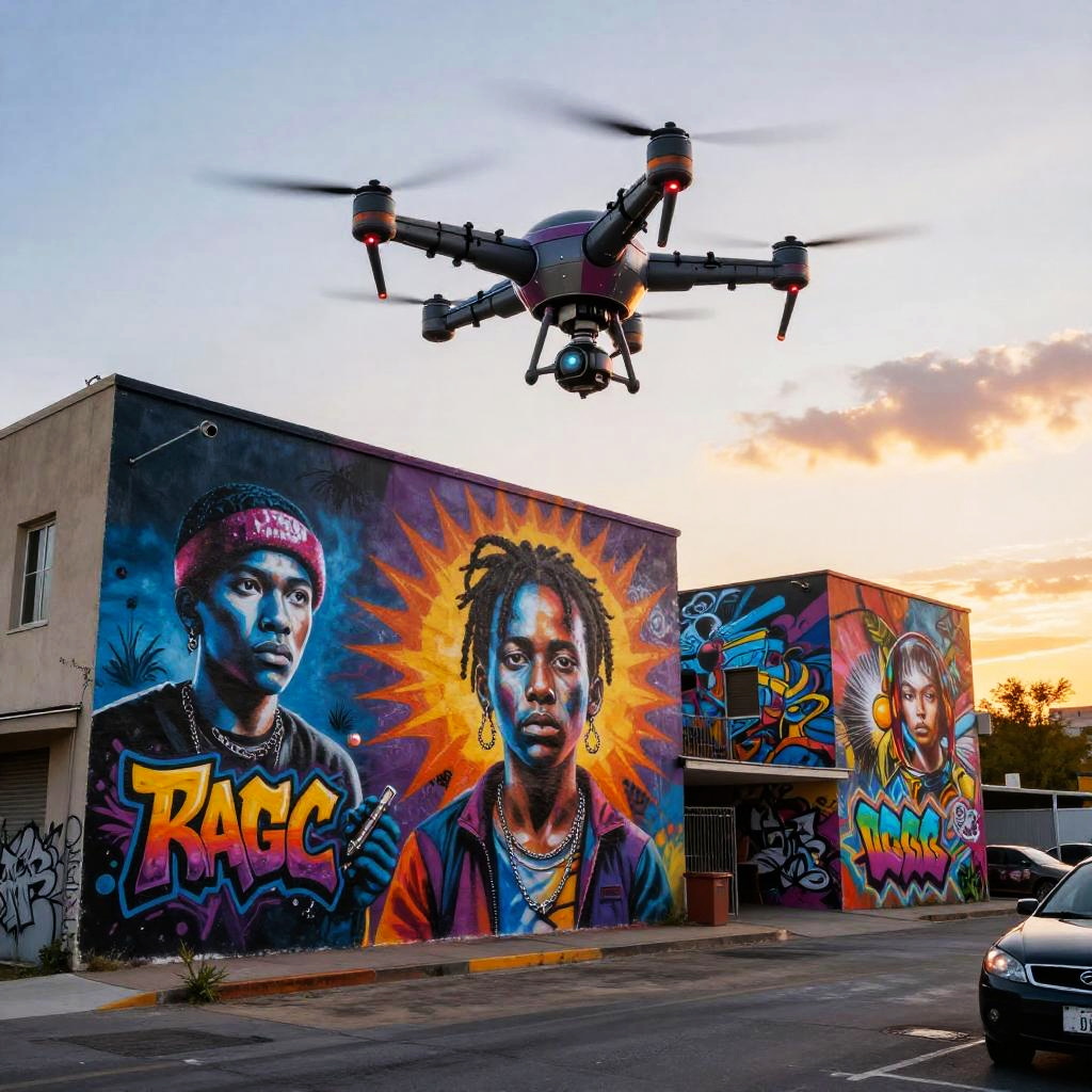 Picture AI free: imaginative scene of autonomous AI drones painting large murals on urban building walls, creating vibrant graffiti art under a sunset sky, blending street culture with futuristic AI creativity, wide-angle view, dynamic composition, vivid colors.