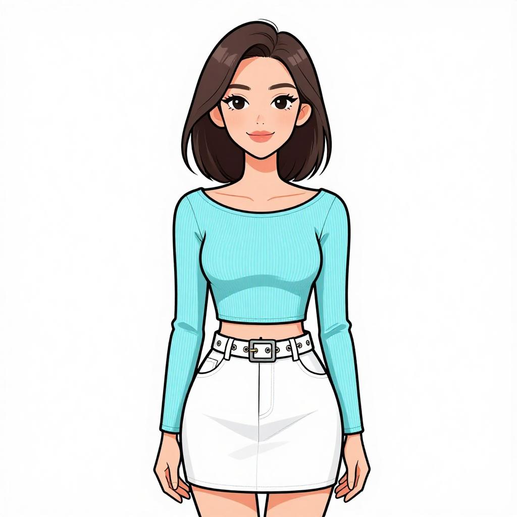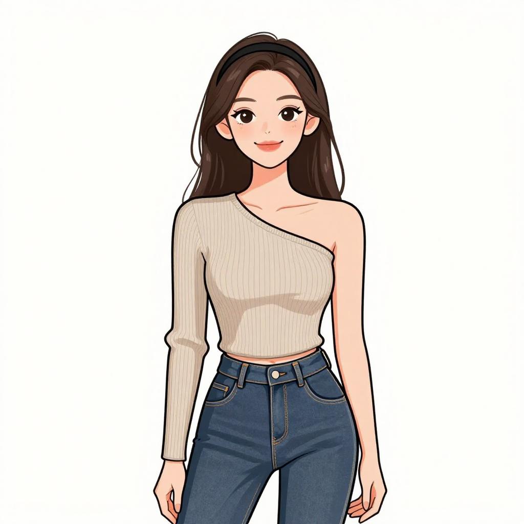 Woman with pretty face and pretty hair. smiling Woman, casual style, cropped long-sleeve top in light pink with a horizontal ribbed pattern and scalloped lace trim at the hem, simple gold necklace, dark blue denim jeans with a mid-rise waist and slight fading, plain white background. --sref 1467