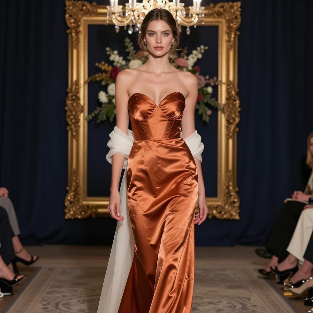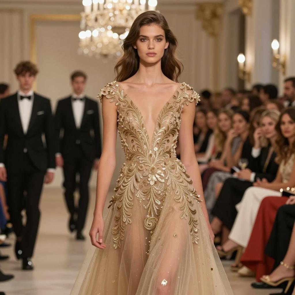 Gold contemporary dance, photorealistic, fashion show, female model, walking down hallway, gold metallic mini dress, strapless, fitted, slightly asymmetrical hem, light brown wavy hair, neutral expression, beige high heels, natural light, modern interior, large grid window in background, polished floor, arms at sides, hands on hips, daytime, white walls, contemporary, elegant, confident, runway, full body shot