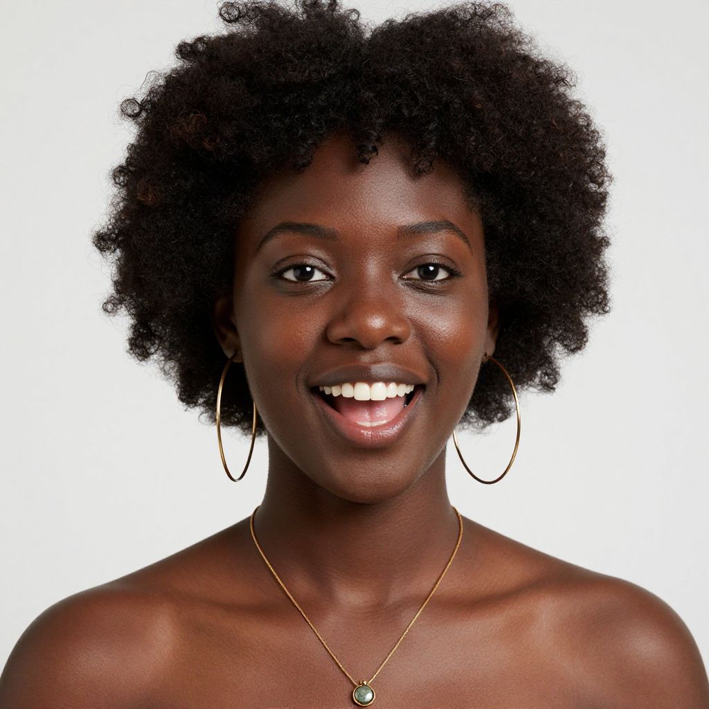 African american natural, jewelry, solo, earrings, dark skin, 1girl, necklace, very dark skin, hoop earrings, afro, dark-skinned female, realistic, black hair, curly hair, portrait, smile, open mouth, looking at viewer