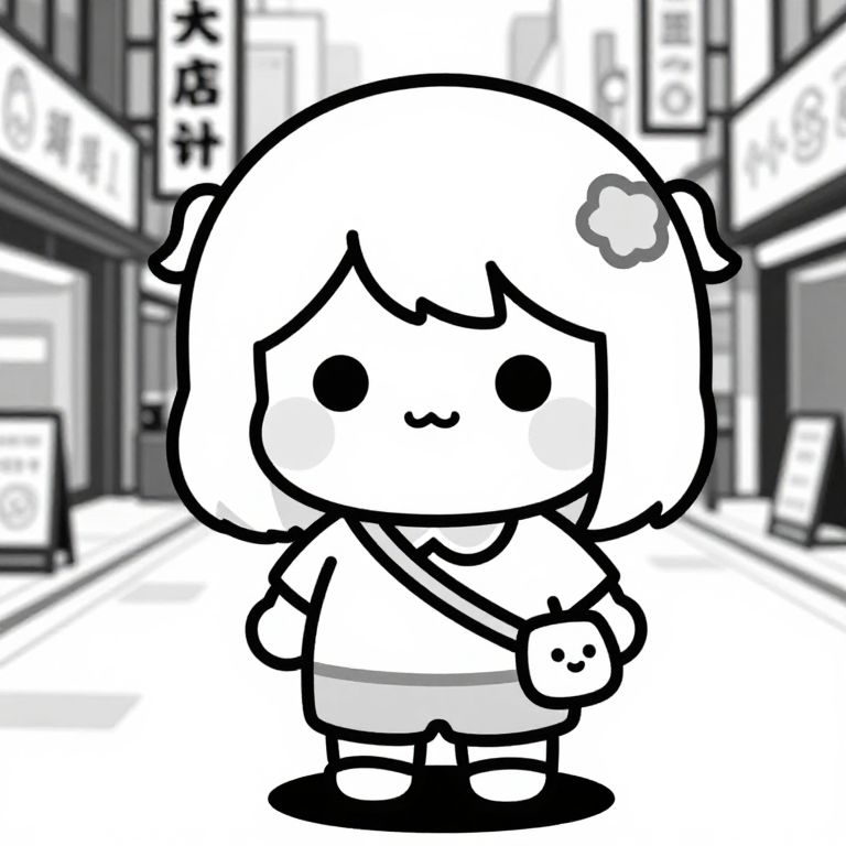 Kawaii Pastels a girl in taipei street, black and white, style of coloring book, no shading, style of cartoon,