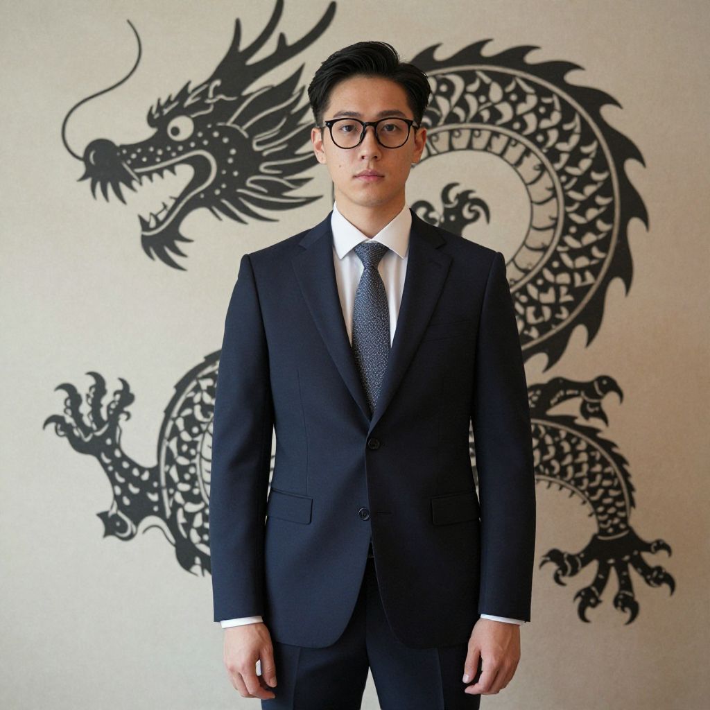 "Trendy Corporate Wear, man in a suit and glasses standing in front of a wall with a dragon"