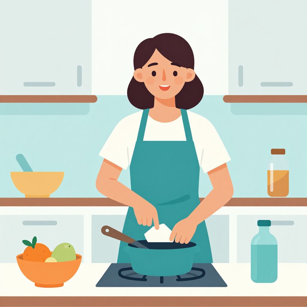 Digital illustration of a smiling woman with fair skin and black hair, wearing a white shirt and blue apron, cooking in a modern kitchen. She stands at a stovetop, stirring a pot with a wooden spoon. The background features white cabinets with brown shelves, a yellow bowl with a spoon, a glass bottle of amber liquid, a blue water bottle, and a bowl of oranges and green apples on the counter. The kitchen has a light blue tiled backsplash. The style is vibrant and flat, with bold colors and simplified shapes.