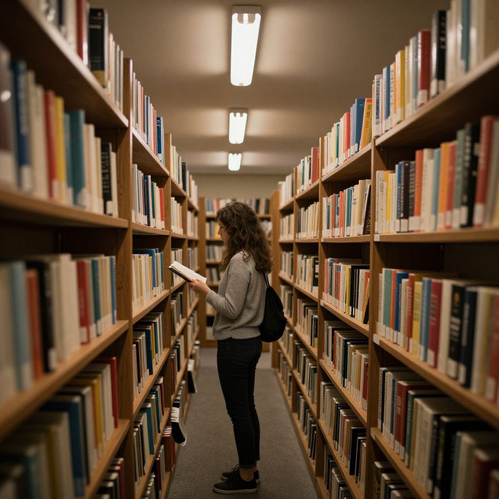 Woman browsing through rows of wooden bookshelves filled with colorful books in a dimly lit library, illuminated by overhead fluorescent lights casting a warm glow over the scene.