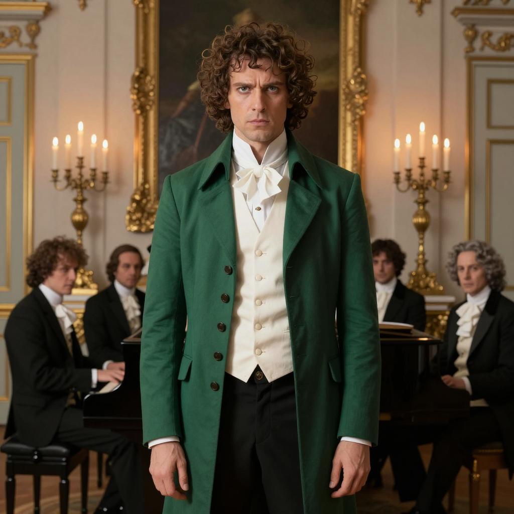 Old man with white curly hair, intense expression, wearing black coat and white cravat, center foreground. Circular theater with dimly lit audience in background. Golden chandeliers along theater walls. Man stands with hands by sides. Dark and warm lighting.