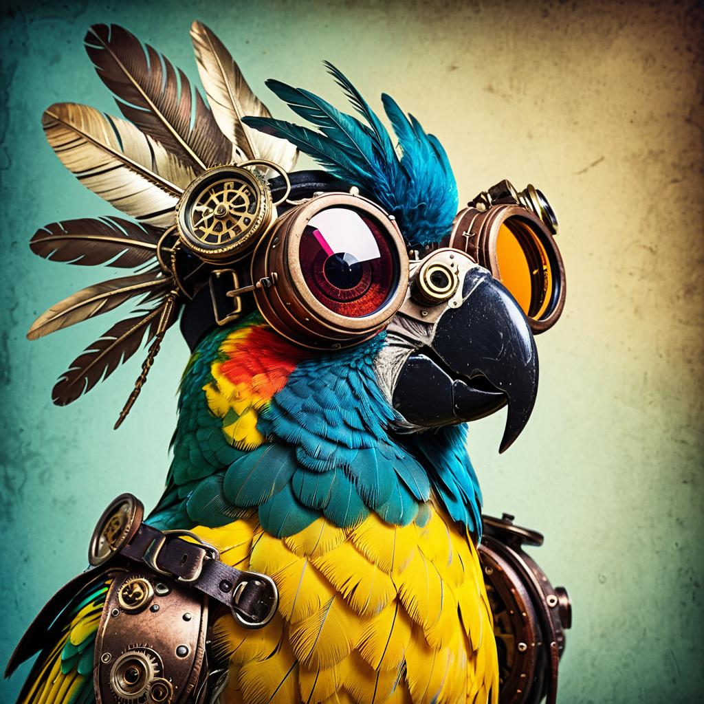 Parrot with steampunk goggles and metallic feathers, whimsical and surreal design, vibrant colors, playful tone