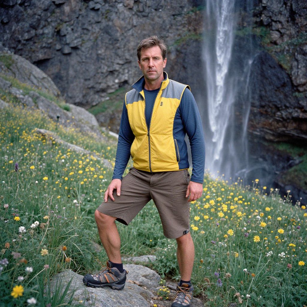 A man, compression fit long-sleeve shirt, rugged climbing shorts, ankle-support trekking shoes, lightweight climbing vest, bright yellow and dark blue contrast, rugged cliffs, vibrant wildflower meadows, cascading waterfalls, kodak sp analog photo, focused expression, adventurous spirit. Man has masculine face and piercing eyes