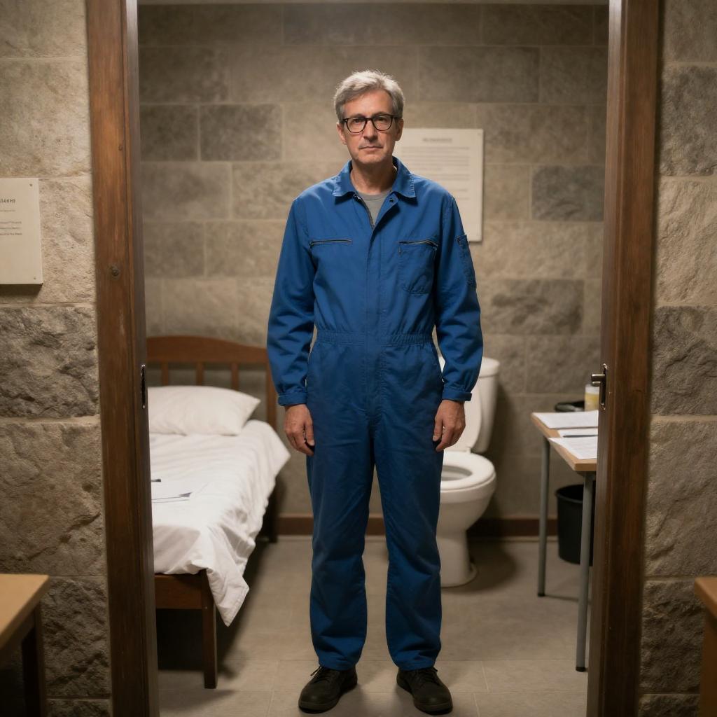 Photograph of a middle-aged man with short gray hair, wearing glasses and a blue jumpsuit, standing in a stone-walled cell. He has a neutral expression. The cell has a bed with white sheets to the left, a toilet behind him, and papers on a table to the right. Two wooden posts frame the cell entrance.