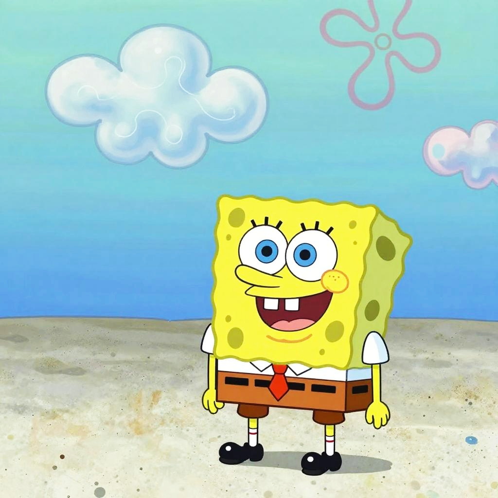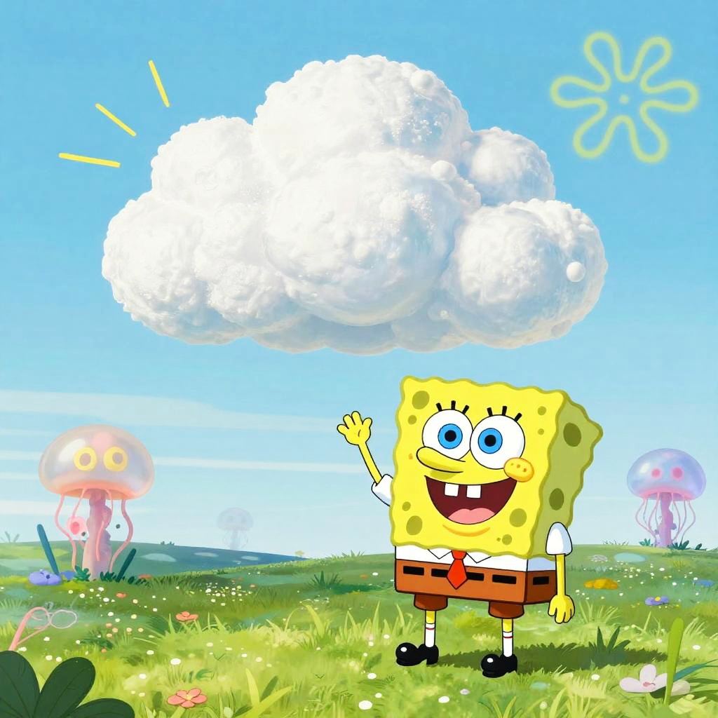 Fantasy clouds from SpongeBob forming cartoonish shapes, floating high above Bikini Bottom, bright colors, playful and detailed animation style, capturing a light and happy mood