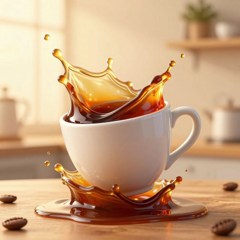 A dynamic 3D-rendered scene captures a coffee cup overflowing with a dramatic splash of rich, amber liquid, defying gravity and kitchen constraints, rendered in high-definition detail against a warm, golden-hour backdrop.