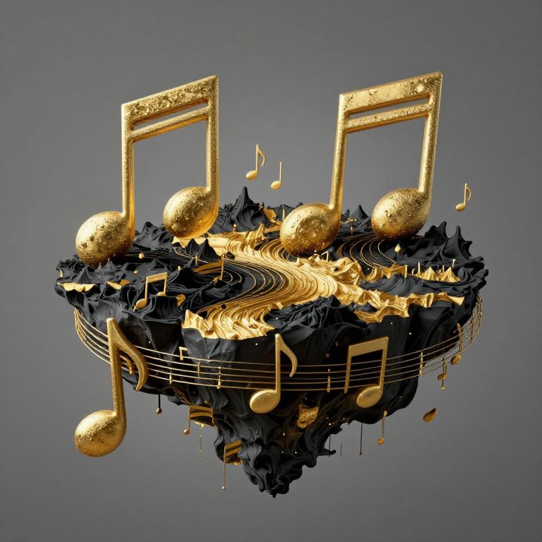 Digital artwork of golden musical notes and spheres on a black, swirling, textured background with floating musical symbols.
