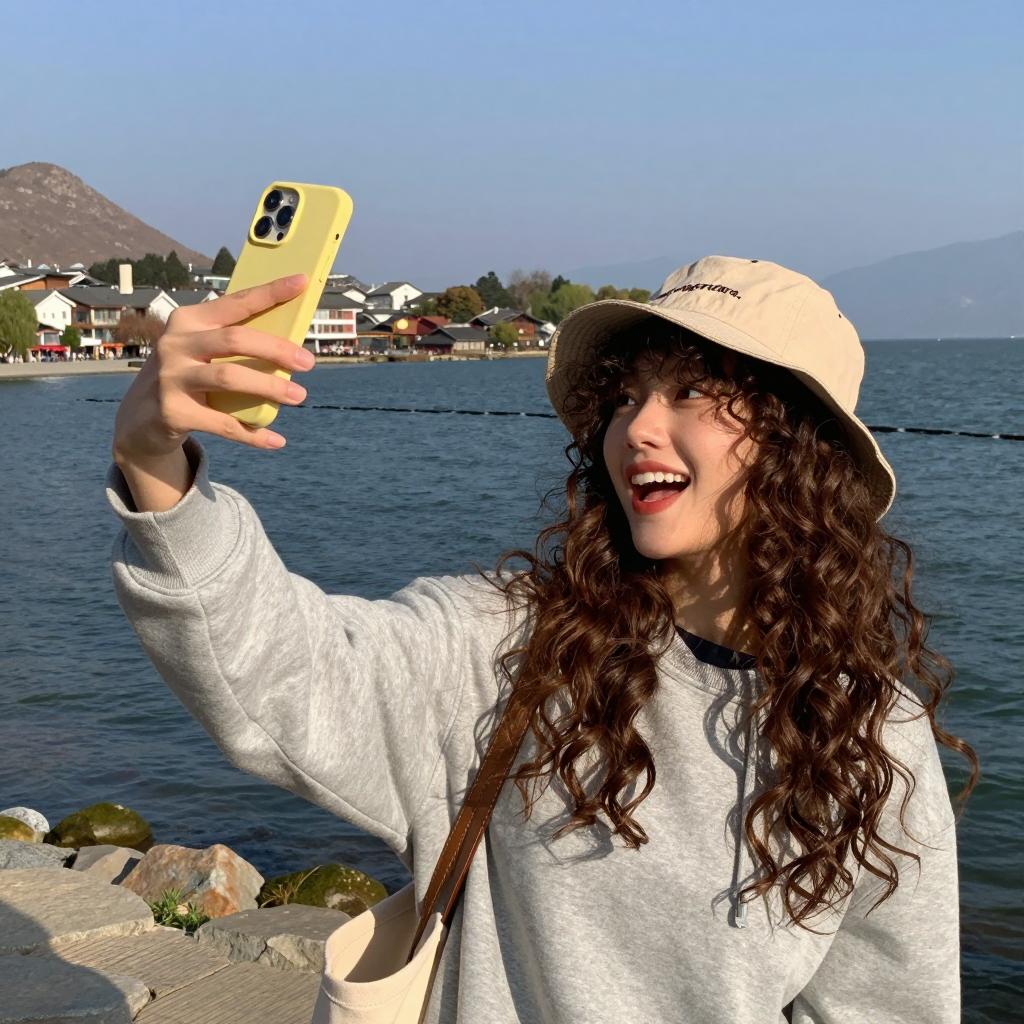 Woman with light skin, wearing red hoodie and black cap, takes selfie in bathroom. Brown wooden walls, dark blue sex toy on hook in background. She looks to the side with slight smile. Right hand holds white phone.