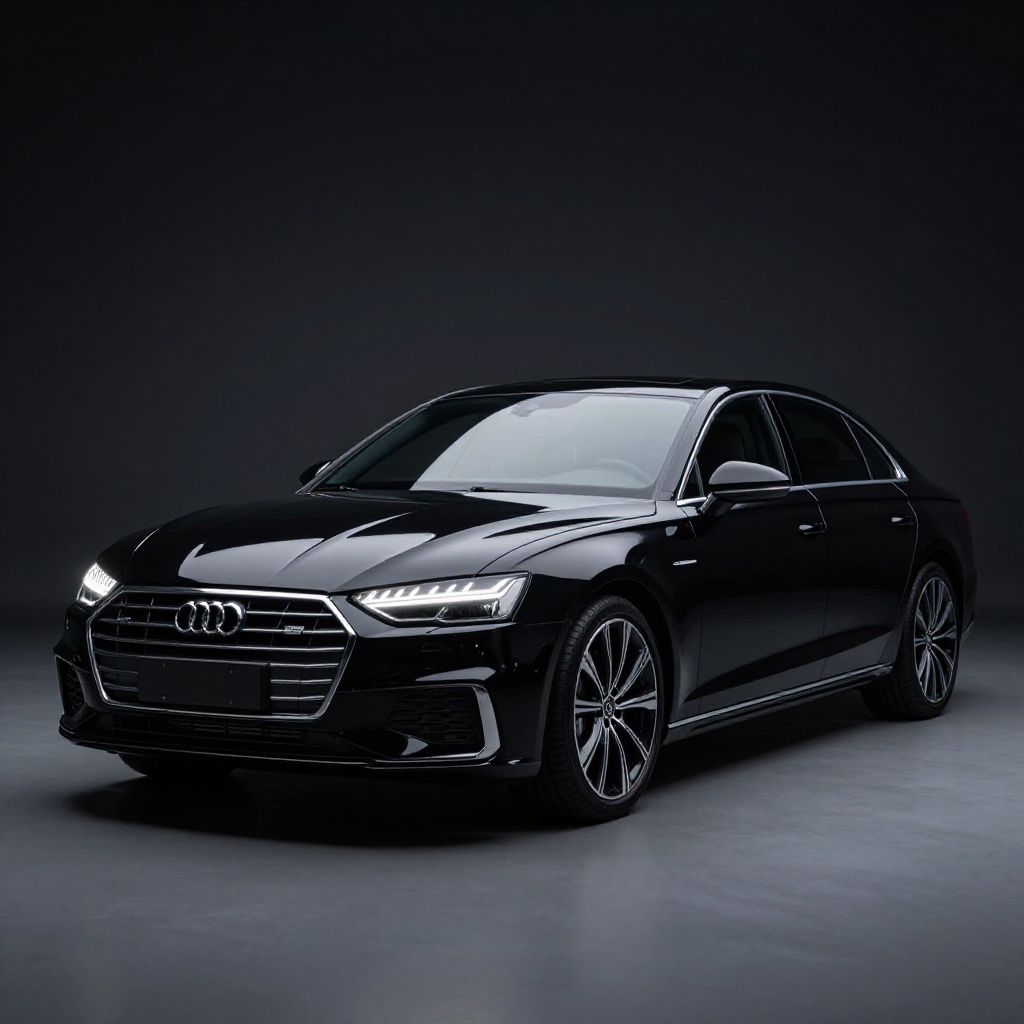 Photograph of a sleek, black Audi sedan with sharp LED headlights, modern grille, and alloy wheels, set against a dark, gradient background.