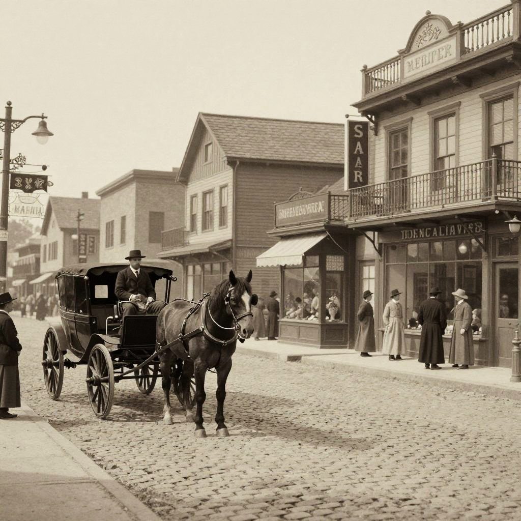 Manheim vintage street scene from early 20th century, cobblestone roads, horse-drawn carriages, people in period clothing, old-fashioned storefronts with intricate signage, muted earthy tones, nostalgic and detailed illustration