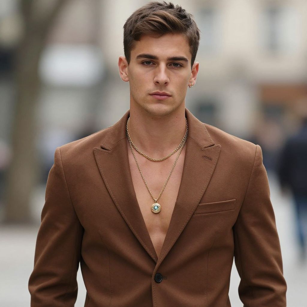 Photograph of a young, handsome man with short brown hair, wearing an unbuttoned brown suit jacket, gold chain necklaces, and no shirt