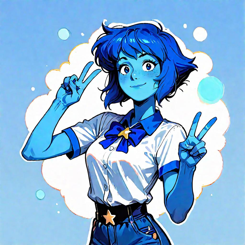 Lapis_lazuli_lora lapis_sfw sfw, 1girl, blue hair, lapis lazuli \(steven universe\), steven universe, rating_safe, wholesome, INFP introvert creative individualistic, v, peace sign, detailed hands, happy, looking at viewer, breasts, slim slender, blue skin, colored skin, source_anime, anime, score_9, score_8_up, score_7_up