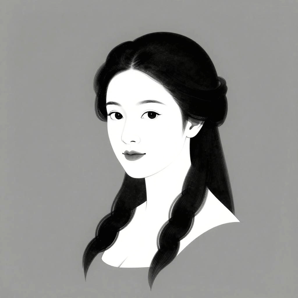 Minimalistic black and white gonchorya portrait of a young monk, beautiful hair, inspired by Georges Rouault, elegant and refined, stark contrasts