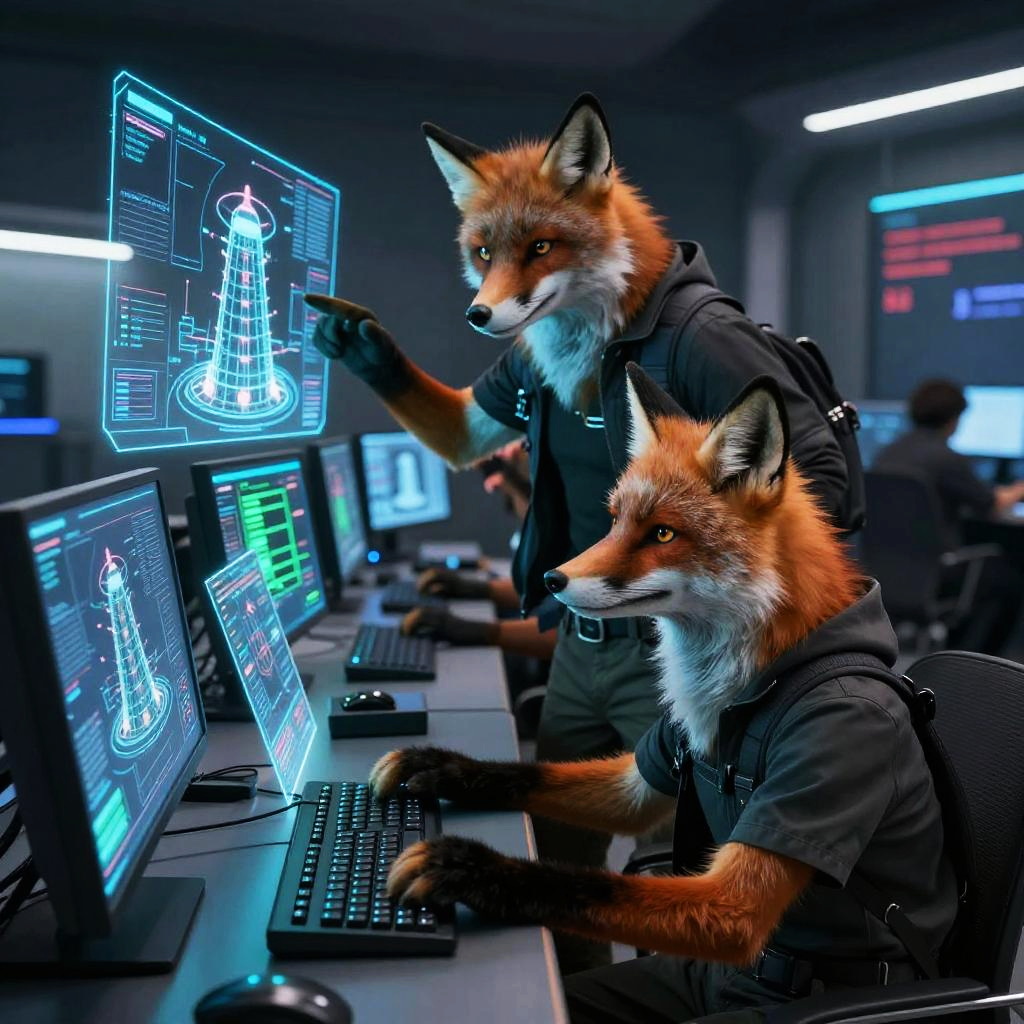 Furries hack nuclear codes in a sci-fi control hub, anthropomorphic rabbits and bears typing on holographic keyboards, bright neon symbols flashing nuclear warnings, digital data streams surrounding them, dramatic cyber espionage scenario with high-tech visuals
