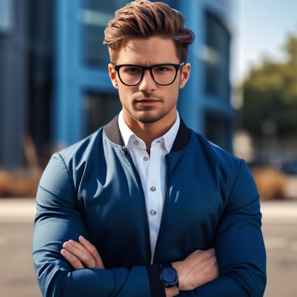 Portrait of a confident young man with light brown hair and a short beard wearing round glasses and a blue jacket over a white t-shirt, standing outdoors with arms crossed. The background shows blurred urban elements including parked cars and trees.