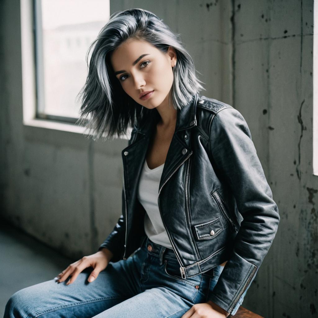 Steel Gray hairstyle on woman, wearing leather jacket and denim jeans, in photo set, captured in fashion editorial style with soft natural light.